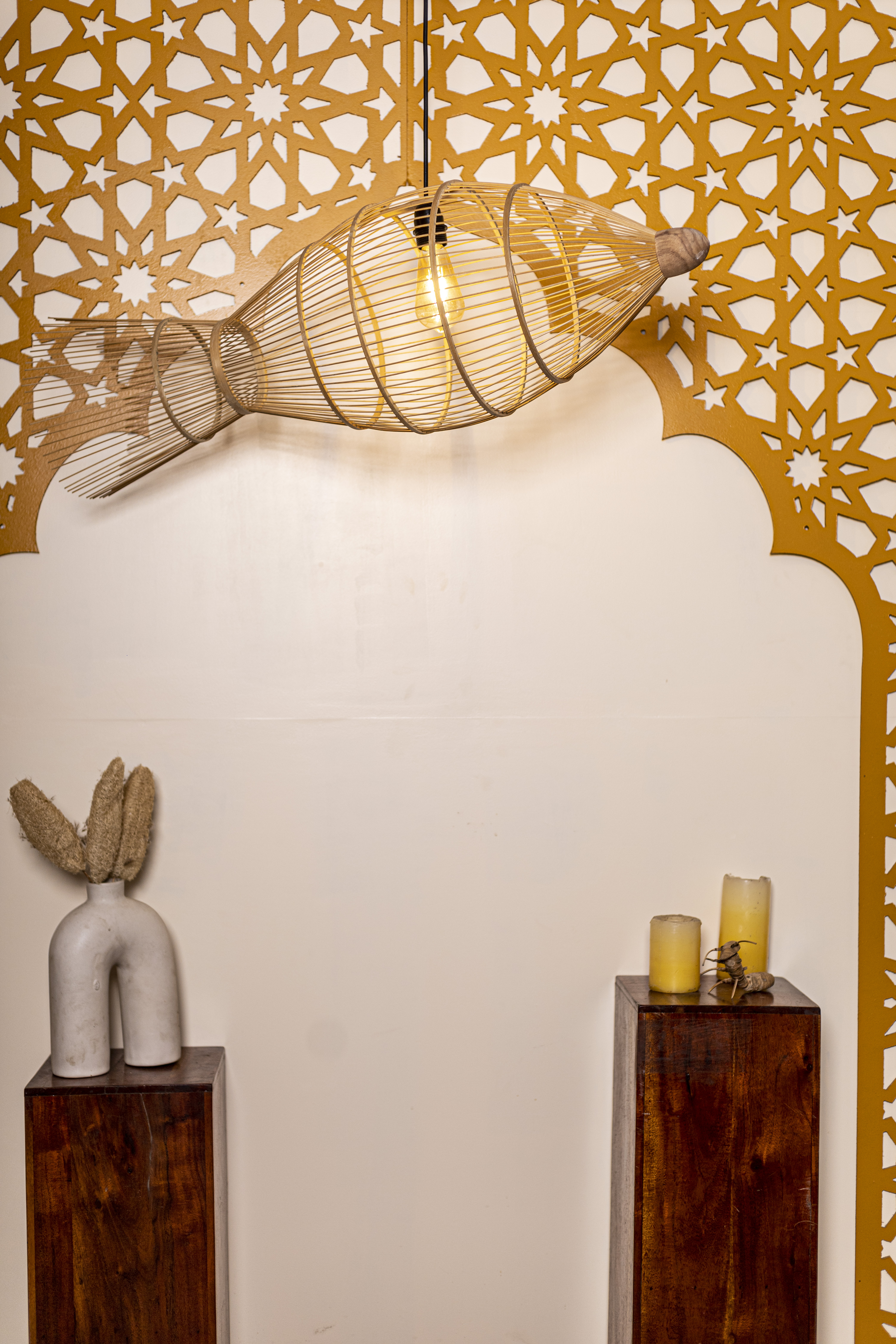 Handwoven lighting accent crafted by local artisans.